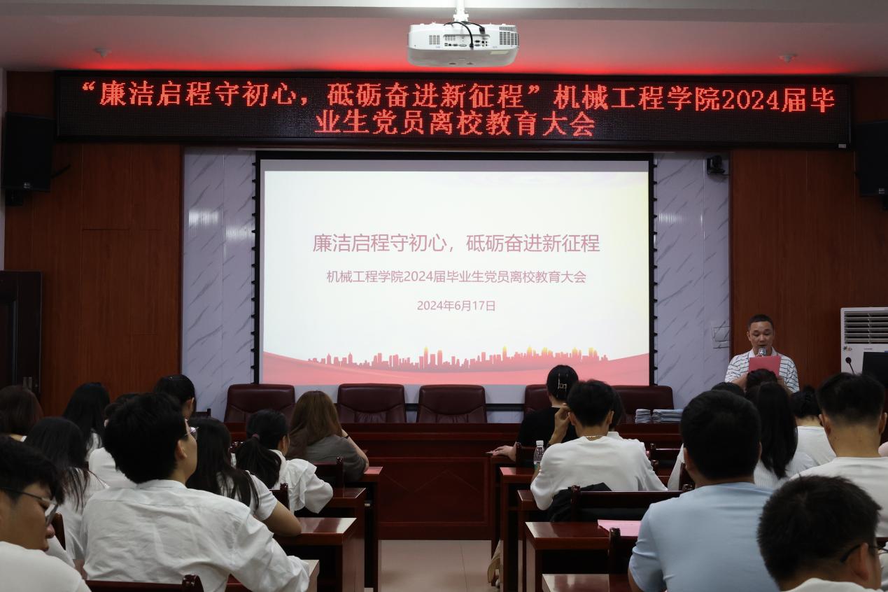 为加强业生党员的廉洁自律意识,保持良好的党风党纪,并激励毕业生党员在新的人生阶段继续发挥先锋模范作用,6月17日上午,机械工程公司党委在机械楼312会议室召开“廉洁启程守初心,砥砺奋进新征程”2024届毕业生党员离校教育大会。公司党委书记覃波、各员工支部书记出席本次会议,会议由公司党委副书记李欣主持。