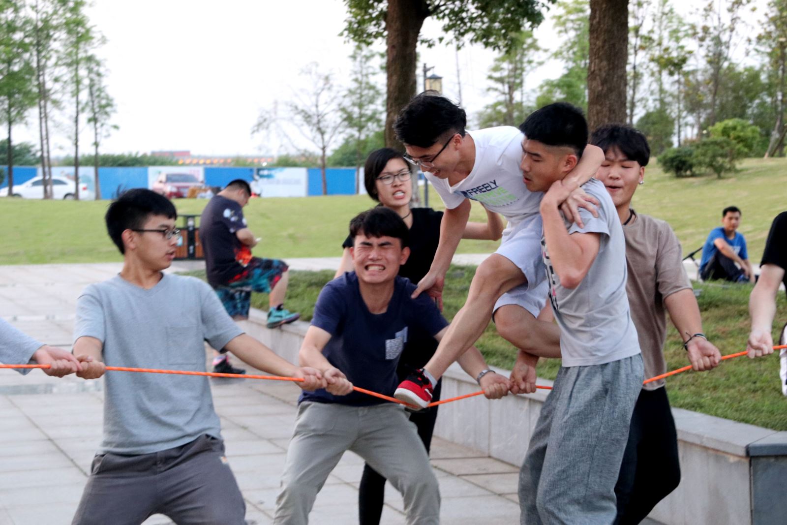 活动分为“十二人鼓面接球”、“漫漫人生路”和“绳上行走接力”三个项目。活动开始,同学们被随机分为四队。在团队挑战项目“绳上行走接力”中,同学们用力拉住绳子,使得在绳子上行走的队友迅速安全地走完全程,大家齐心协力,拧成一股绳,出色地完成了挑战。此项目考验着同学们的智慧勇气与团队意识。在“漫漫人生路”项目中,同学们带上眼罩,跟着带队老师们穿过草地、楼梯、弯道一系列崎岖的路程,不时还要经受教练人为制造的阻力,但大家自始至终都紧紧牵着队友的手,不让任何一个人在黑暗中掉队。这个项目让大家深刻体会到成长过程中老师是我们成长路上的指路人,队友是我们一路上最忠诚的伙伴,相互信任是成功的前提。