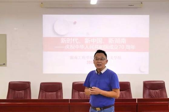 谢骐以“新时代、新中国、新湖南”为题,描述了从中国共产党的建立到中华人民共和国的成立,再到改革开放后,中国特色社会主义道路的发展历程。他指出,新中国成立70周年以来,我国经济的迅速发展离不开党的正确领导、人民群众的团结奋斗,从“两弹一星”到“和谐号”,再到70年来我国人均GDP近70倍的增长,我国综合国力得到了快速提升,人民生活水平得到了极大改善。党的宗旨是“为人民服务”,我们必须坚定不移地跟党走,他强调只有中国共产党才能带领中华民族走向复兴。他结合自身的生活经历,真真切切地为同学们描述了新中国成立70周年来,湖南的经济产业,教育事业等方面得到迅速发展的新局面。会议末,谢骐用问答的方式与同学们就会议主题进行了深入交流。