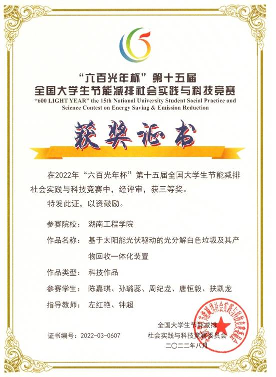 本届大赛共608所高校员工参加,提交有效作品近6000件。2022年8月5日,“六百光年杯”第十五届全国老员工节能减排社会实践与科技竞赛落下了帷幕。经过激烈的角逐,太阳成tyc122cc参赛作品《基于太阳能光伏驱动的光分解白色垃圾及其产物回收一体化装置》(参赛员工:工业工程1901班陈嘉琪、孙璐蕊、周纪龙、工业工程1902班唐恒毅、扶凯龙;指导老师:左红艳、钟超)在本次竞赛中荣获大赛三等奖。