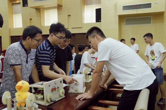7月5日上午,在太阳成tyc122cc的二报告厅里,“仿生扑翼鸟”、“自动印章机”、“助老马桶”、“自动鞋柜”、“步行机器人”、“脚踏洗衣机”等15件精心制作的机械创新设计作品整齐的摆放在展示台上。各参赛团队的组长依次对作品进行PPT汇报和作品实物功能展示。每组汇报完毕,专家对作品进行点评,同学们进行提问,评委进行现场评分。台上妙语连珠,台下掌声阵阵,气氛紧张热烈……。