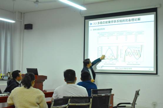 周生喜指出,能量俘获就是把环境中未被充分利用的能量进行充分利用,他以水的机械能和风的机械能转换为另一种机械能为例,加深老师和员工对能量俘获概念的理解。他根据团队研究成果,以研究数据为基础,从研究背景出发,围绕旋转式磁耦合的非线性能量俘获结构、宽频带多稳态能量俘获机理、非线性能量俘获增强机理,以及面向实用化的能量俘获设计、建模和测试这四个方面详细阐述了振动能量俘获的理论与应用。他结合具体实例,介绍了振动能量俘获在工程、航空、人体等方面的应用,并指出振动能量俘获的应用前景和优势。报告会气氛活跃,周生喜与师生进行了亲切的交流,师生们均表示受益匪浅。