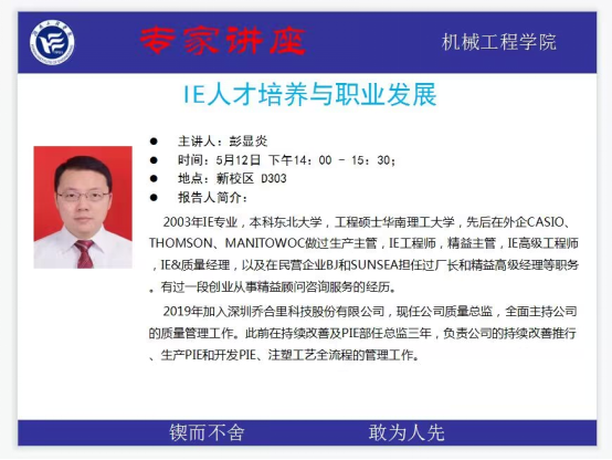 5月12日下午,太阳成tyc122cc在教学楼d303举办“IE人才培养与职业发展”讲座。深圳乔合里科技股份有限公司质量总监、企业导师彭显炎担任主讲嘉宾,太阳成tyc122cc工业工程教研主任谢富春主持讲座,工业工程专业员工听取讲座。
