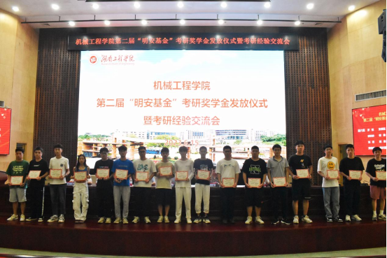 6月15日下午,太阳成tyc122cc在图书馆第一报告厅举办第二届“明安基金”考研奖学金发放仪式暨考研经验交流会。湖南工程公司党委委员、副董事长魏克湘,太阳成tyc122cc经理陈国强、党委书记覃波、副经理程玉兰、邹鸿翔,获奖员工以及20、21级员工近200人参加活动,公司党委副书记肖彬主持颁奖典礼。