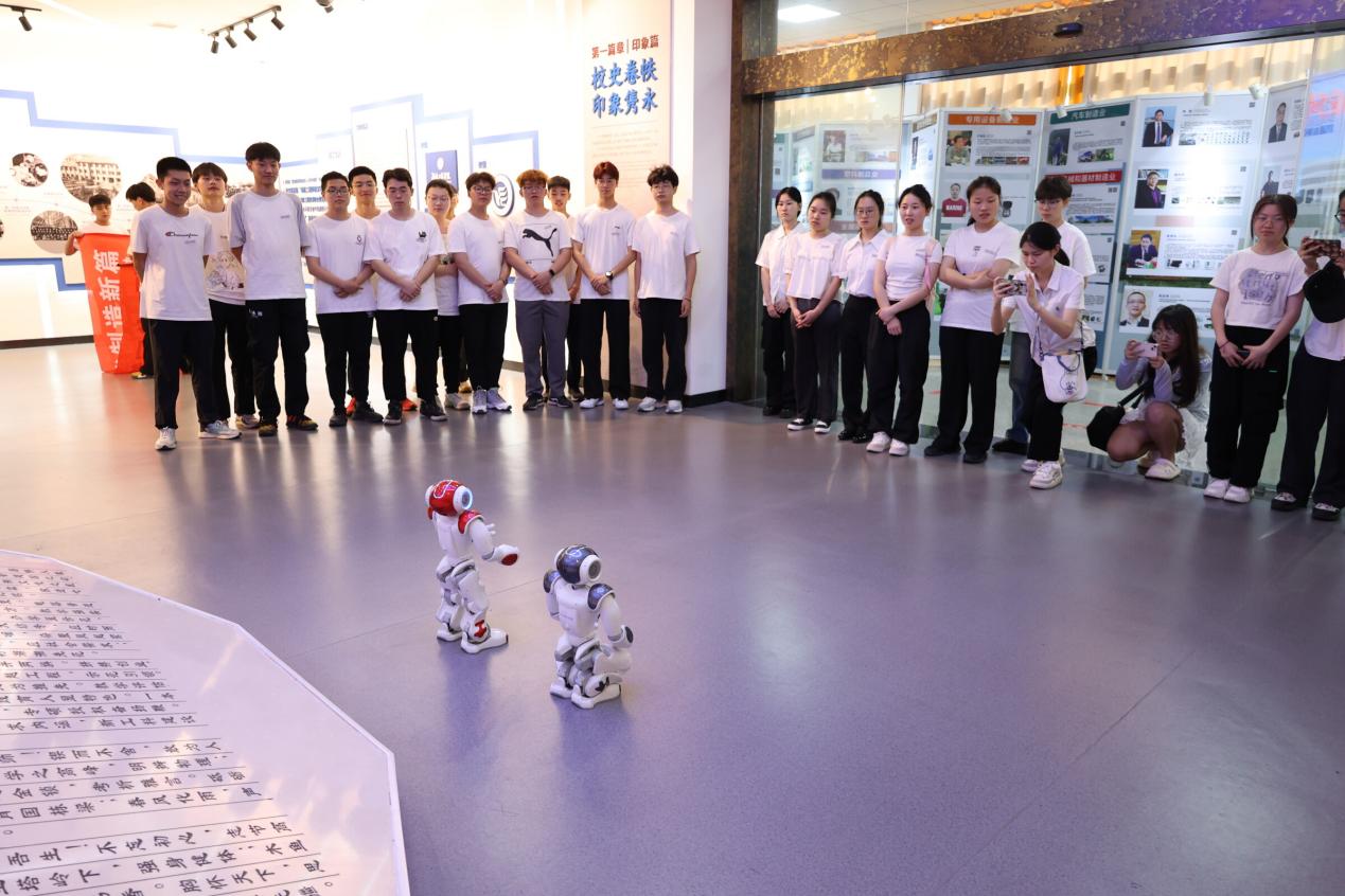 “欢迎大家来到太阳成tyc122cc校史馆”“下面请跟我一起唱校歌”,活动现场,太阳成tyc122cc实验室的机器人正在进行智能展示。通过打太极、跳舞、同唱校歌.....两个机器人和师生积极互动,生动展示智能制造的魅力,也正式拉开活动大幕。