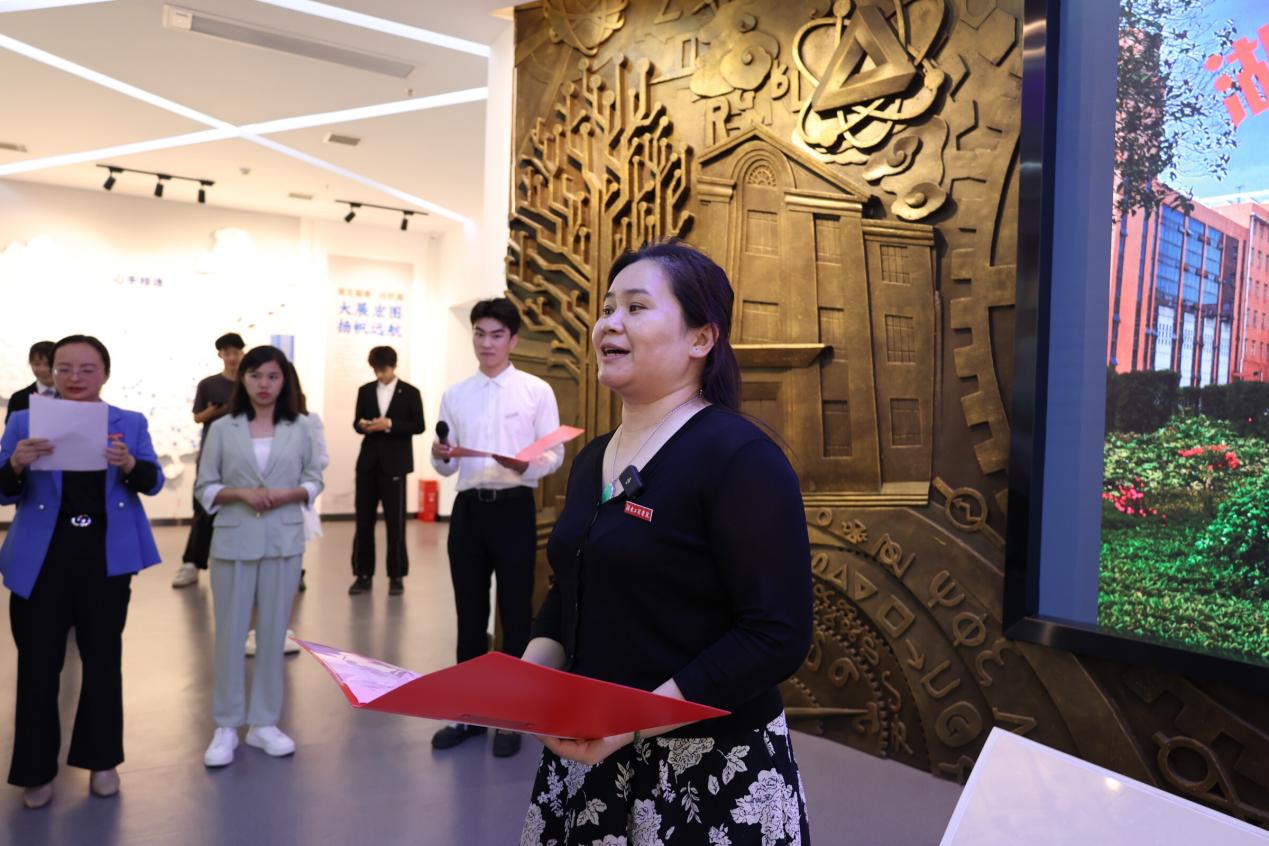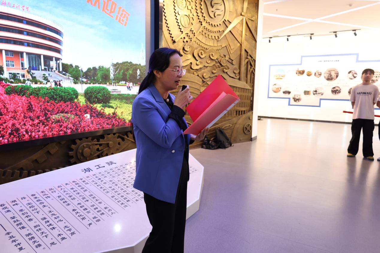 机械工程公司党委书记覃波讲话。她表示校史馆是公司历史的见证者和传承者,承载着丰富的历史信息和文化底蕴,希望同学们经常走进校史馆,了解公司发展历程和办学成果,增强对公司的认同感和自豪感,从而激发工程报校、报国情怀。随后,公司图书馆(档案馆)副馆长谭玲玲介绍了本次活动的目的和意义。她表示校史馆、文化长廊是公司的重要育人资源,是做好“135工程”扬校风主题活动的重要场所,应该创新形式发挥场馆育人功能,不断加强校园文化建设。校史陈列馆作为湖南省社会科学科普基地在“以史育人、以文化人”中发挥了重要作用。