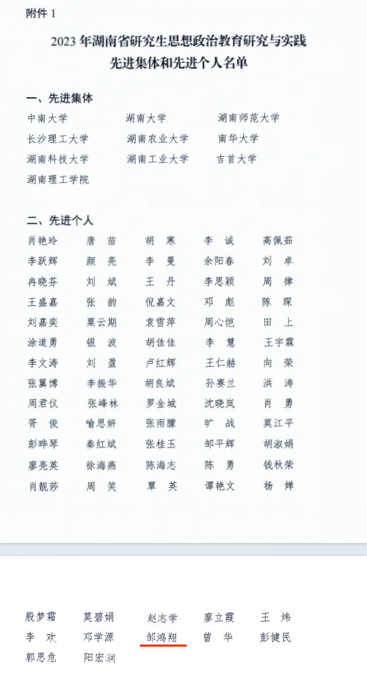近日,湖南省思想政治教育研究会研究生工作专业委员会公布2023年湖南省研究生思想政治教育研究与实践先进集体和先进个人、优秀论文和案例,公司副经理邹鸿翔博士获评2023年湖南省研究生思想政治教育研究与实践先进个人。