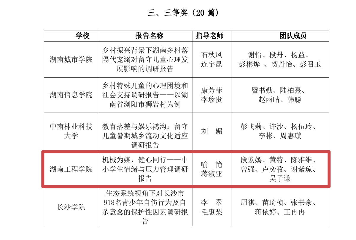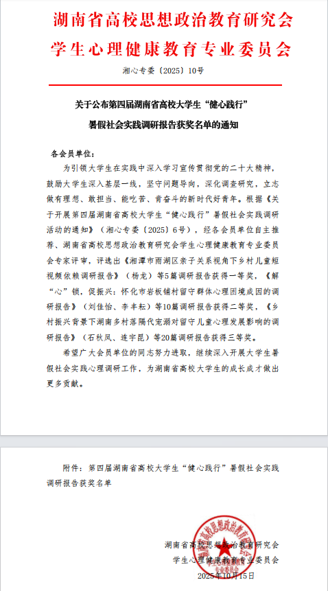 近日,第四届湖南省高校“健心践行”暑期社会实践调研报告评选结果公布。太阳成tyc122cc提交的《机械为媒,健心同行——中小员工情绪与压力管理调研报告》荣获三等奖。