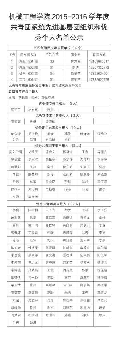 根据公司《评选机械 工程公司2015-2016学年度共青团系统先进基层团组织和优秀个人的条例》精神及公司的有关文件要求,本着公开、公正、公平、透明的原则,公司 2015-2016学年度共青团系统先进基层团组织和优秀个人的工作已评选结束,现将关于公司2015-2016学年度共青团系统先进基层团组织和优秀个人评审名单公示如下,公示期为2017年5月4日—5月7日,请广大师生监督。