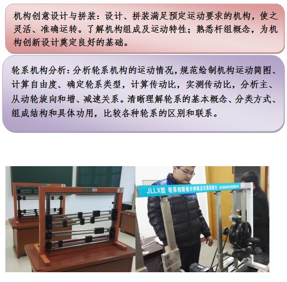 主要仪器设备:轮系创新设计拼装及仿真实验台、机构创新设计实验台