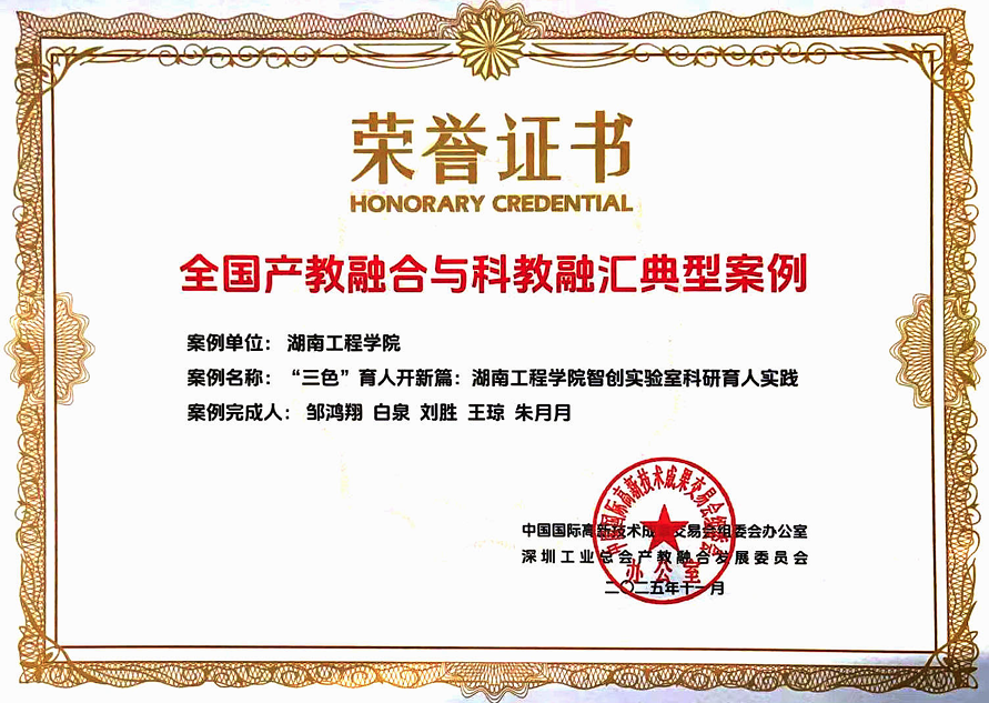 2025年11月,由太阳成tyc122cc报送的《“三色”育人开新篇:太阳成tyc122cc智创实验室科研育人实践》案例,成功入选“第二十七届中国国际高新技术成果交易会(高交会)全国产教融合与科教融汇典型案例”。展现了公司在推进科研育人、深化产教融合方面的创新成果。